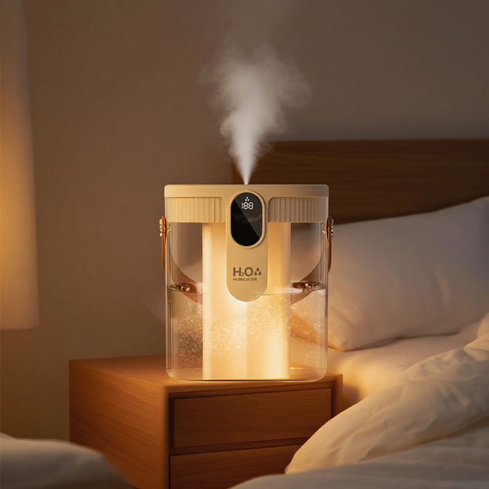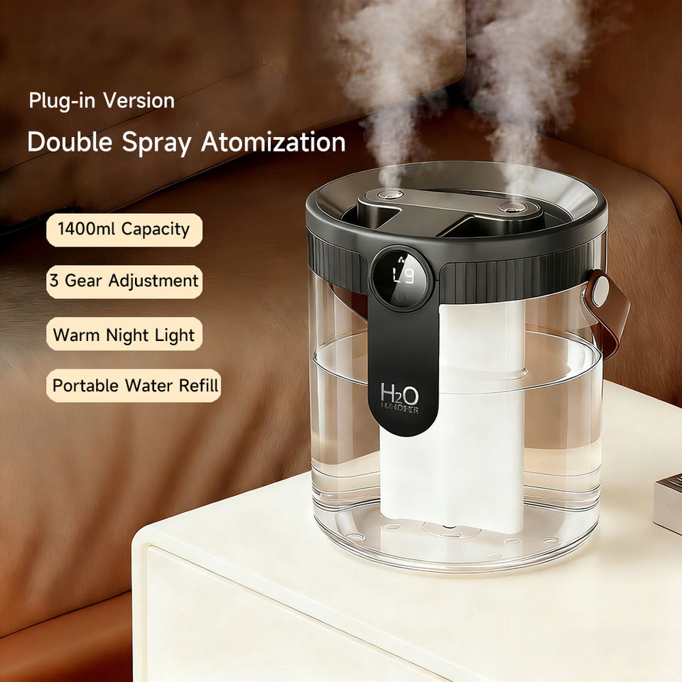 This dual-spray humidifier is designed to improve air moisture in your room, office, or personal space. It produces a nano-fine mist for better hydration and comfort, and also includes a warm atmosphere light for a relaxing environment—perfect for day and night use.